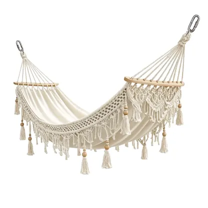 This hammock is made from durable cotton fabric with decorative macramé fringe, providing a relaxing experience both indoors and outdoors.