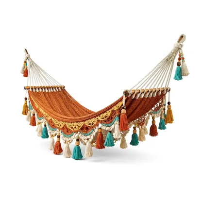 The hammock is made of cotton with wooden beads used for decoration.