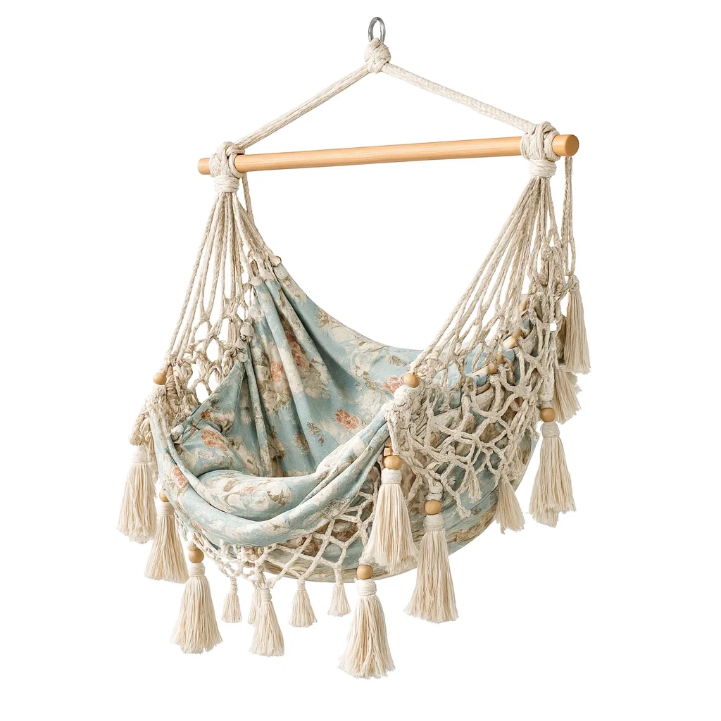 The cotton canvas macrame hanging chair provides a seating option with its floral pattern. The wooden spreader bar ensures weight distribution for stability.